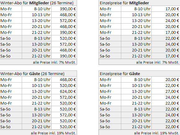 Neben Einzelstunden können Mitglieder und Gäste zu einem vergünstigten Angebot auch Abonnements abschließen und sich so einen festen wöchentlichen Platz für das freie Spiel sichern.